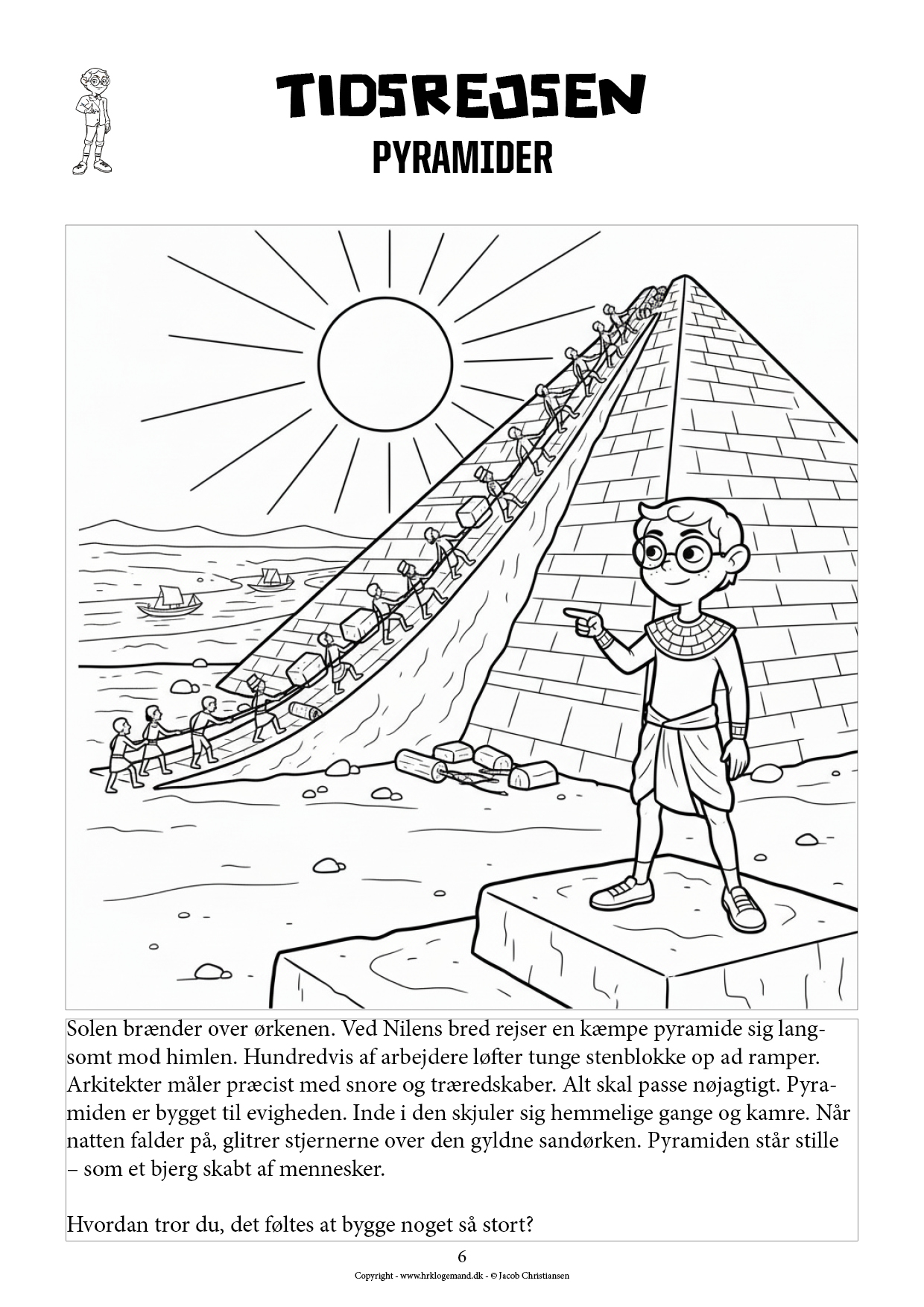 For mere end 4.500 år siden begyndte egypterne at bygge enorme pyramider i ørkenen langs Nilen. De fungerede som grave for faraoerne, der blev betragtet som guddommelige herskere. Den største, Keopspyramiden, består af millioner af stenblokke, som hver vejer flere tons. Arbejderne brugte ramper, slæder og simple redskaber til at flytte de tunge sten. Byggeriet krævede præcis planlægning og stor viden om matematik og stjernernes bevægelser. Pyramiderne blev placeret, så de næsten perfekt følger verdenshjørnerne. Indenfor gemmer sig smalle gange og gravkamre. Selvom tiden har slidt på dem, står de stadig som vidnesbyrd om en avanceret civilisation. Pyramiderne viser, hvad mennesker kan opnå gennem samarbejde, organisering og teknisk snilde. I dag besøger millioner af mennesker dem hvert år for at opleve deres størrelse og mysterium med egne øjne.